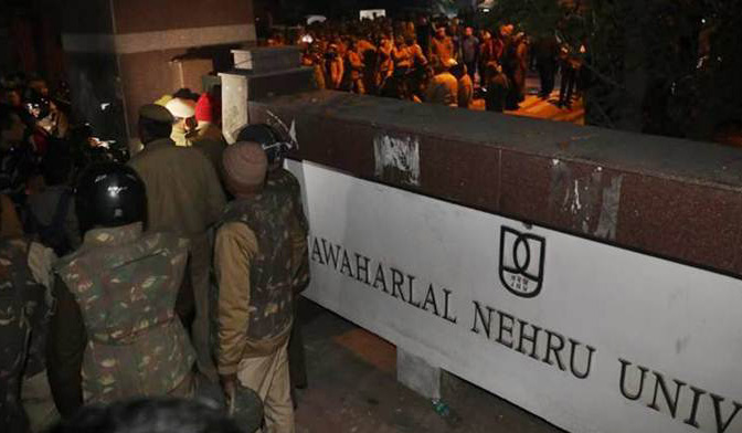 Violence broke out at the JNU campus Sunday night as a group of masked people armed with sticks and rods attacked students and teachers and damaged property on campus, prompting the administration to call in the police.