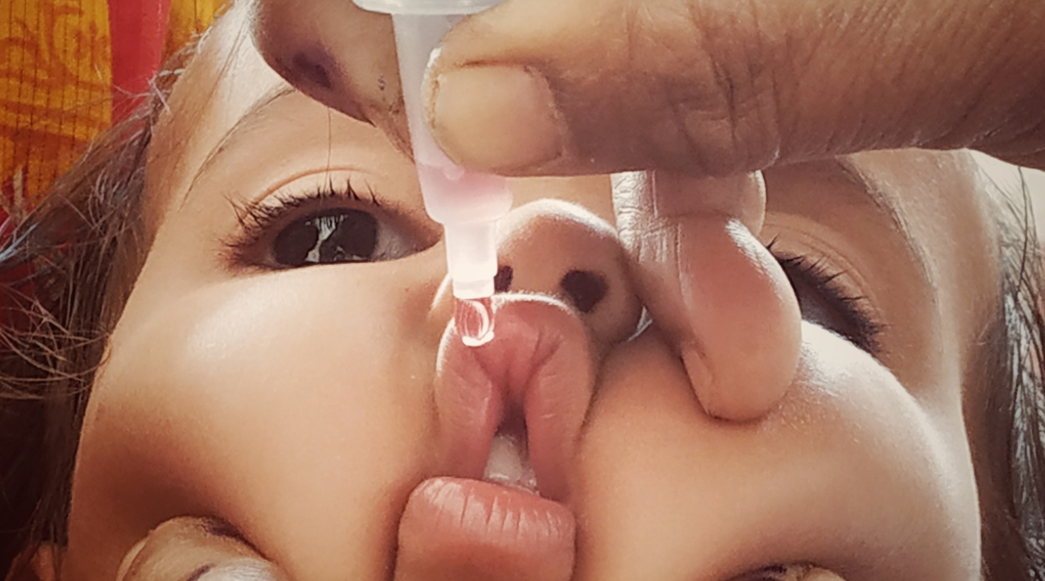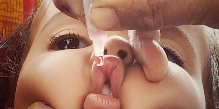 A child is being fed polio drops at Rajkishorepada Anganwadi centre in Angul town