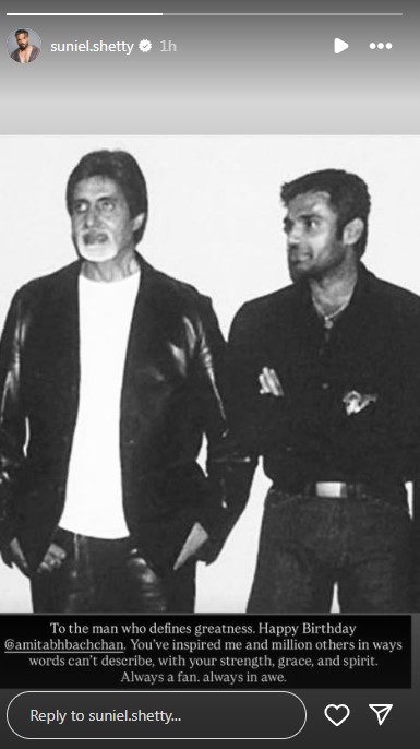 Treating the netizens with a throwback pic with the stalwart, Suniel Shetty added, “To the man who defines greatness… Happy Birthday @SrBachchan. You’ve inspired me and a million others in ways words can’t describe, with your strength, grace, and spirit. Always a fan… always in awe.”