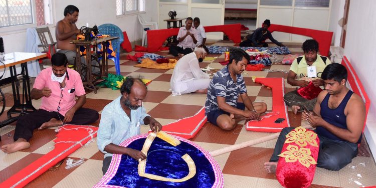 Darzi (tailor) servitors of Srimandir prepare decorative pieces for the upcoming Chandan Yatra of Lord Jagannath, Sunday