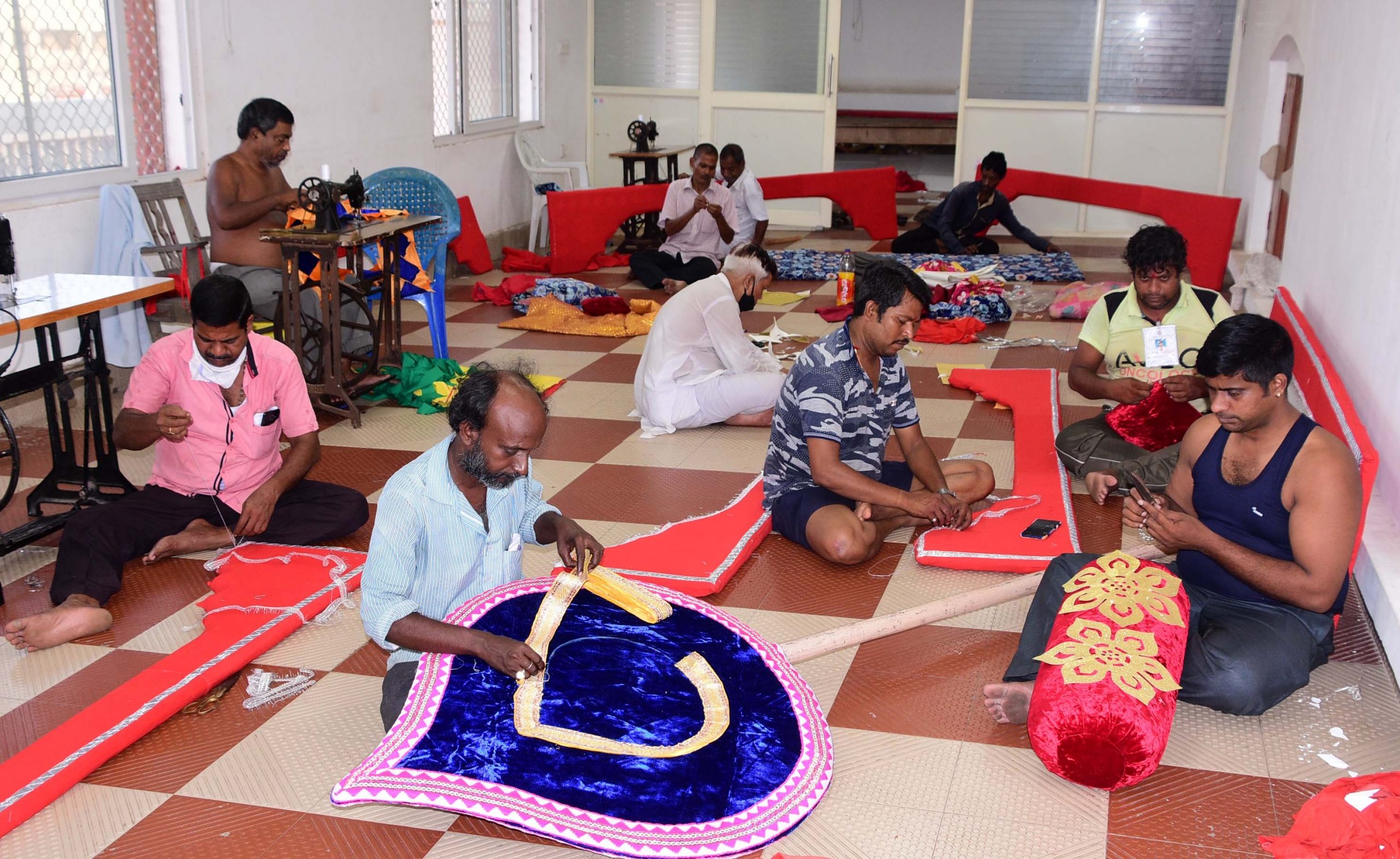 Darzi (tailor) servitors of Srimandir prepare decorative pieces for the upcoming Chandan Yatra of Lord Jagannath, Sunday