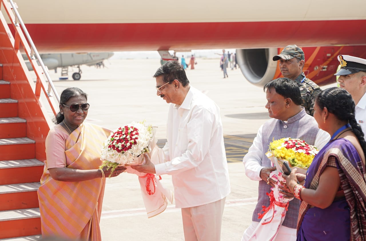 Rourkela: President Droupadi Murmu arrived in Odisha Tuesday to a warm welcome, marking a visit to her home state. Governor Hari Babu Kambhampati and Chief Minister Mohan Charan Majhi received her at Jharsuguda Airport.