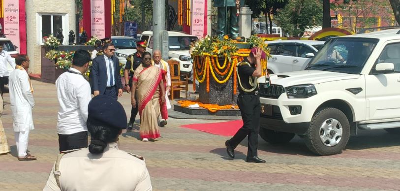 The President landed at the helipad inside the university campus. Following protocol, she paid floral tributes to the statue of legendary Odia writer Fakir Mohan Senapati near the university gate. Governor Hari Babu Kambhampati also offered floral tributes at the statue.
