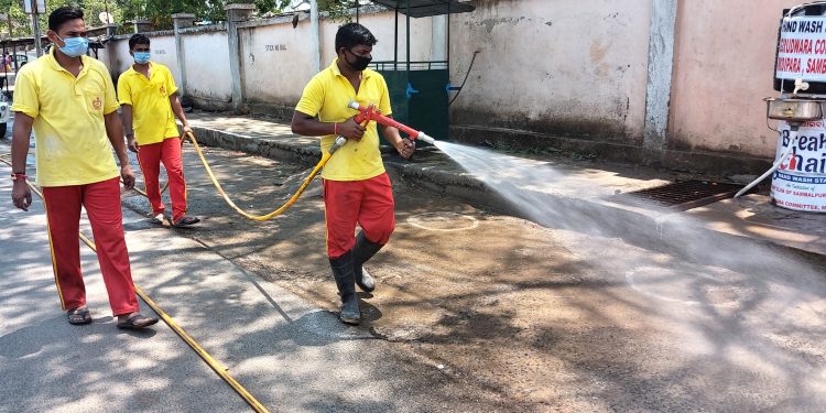 Civic workers sanitise the market area in front of Sambalpur fire-station amid the coronavirus pandemic, Monday