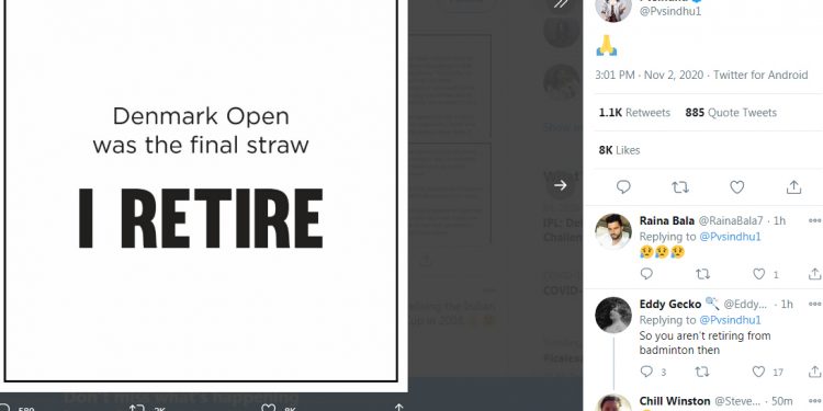 New Delhi: Olympic silver medallist and World Champion PV Sindhu has sent shock waves in the badminton circles with a post on her social media accounts. PV Sindhu has shared a post on Twitter and Instagram. The post read: ‘Denmark Open was the final straw, I retire.’ Interestingly the words ‘I RETIRE’ have been written in capital letters and it sent her fans into frenzy.
