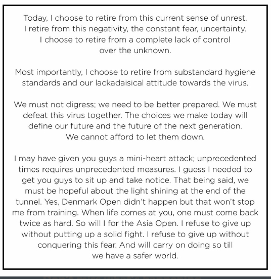 However, the following images calmed the nerves of her fans as she explained the logic behind the post. She explained that the post is about the effects of coronavirus and not a retirement post. This is what Sindhu wrote: