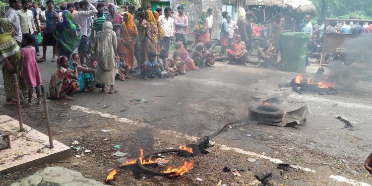 Kendrapara: The residents of Samgudia (Hatapada) village in Ward No-1 of Kendrapara municipality Friday resorted to agitation by burning tyres and placing a log near the RD office on Ichhapur-Angulai Road in protest against the alleged step-motherly attitude of the administration in removing rainwater from the locality.