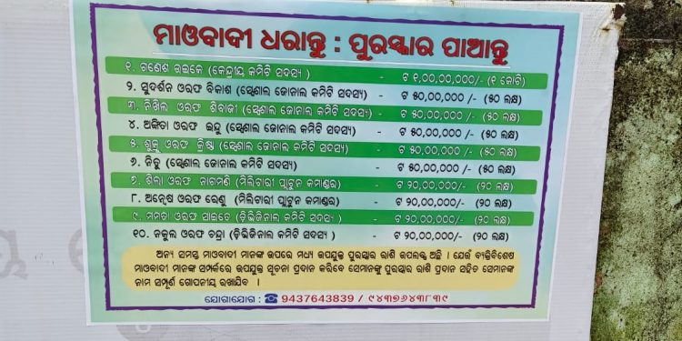 Kalyansinghpur/Rayagada: Posters announcing cash rewards for information leading to the arrest of Maoist leaders have appeared in various parts of the Niyamgiri hill region spanning Kalyansinghpur, Muniguda, and Chandrapur blocks of Rayagada district.