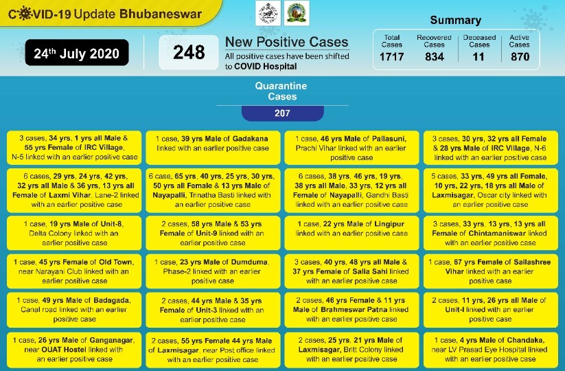 Primary contacts & nearby houses are being quarantined, sanitised & will be under active surveillance. pic.twitter.com/cXFvZudJIy— BMC (@bmcbbsr) July 24, 2020