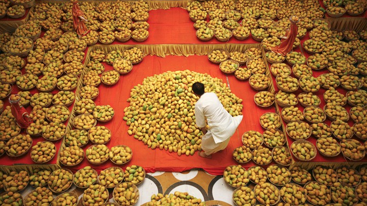 A Hindu priest arranges mangoes to be offered to Hindu God Lord Krishna inside a temple during a mango festival in the western Indian city of Ahmedabad June 9, 2013. (REUTERS)