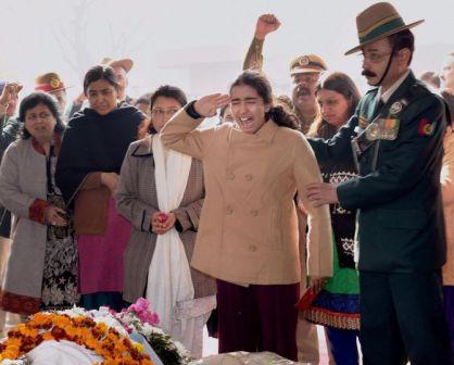 New Delhi: The daughter of Col MN Rai cries as she salutes to pay her last respect to his mortal remains during his cremation in the Delhi Cantt on Thursday. Rai was killed in a gunbattle with militants in south Kashmir’s Pulwama district on Tuesday. PTI Photo by Manvender Vashist