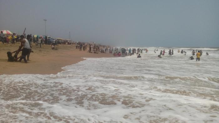 Despite the heavy downpour, tourists in large number have turned up on the beach.