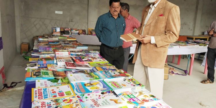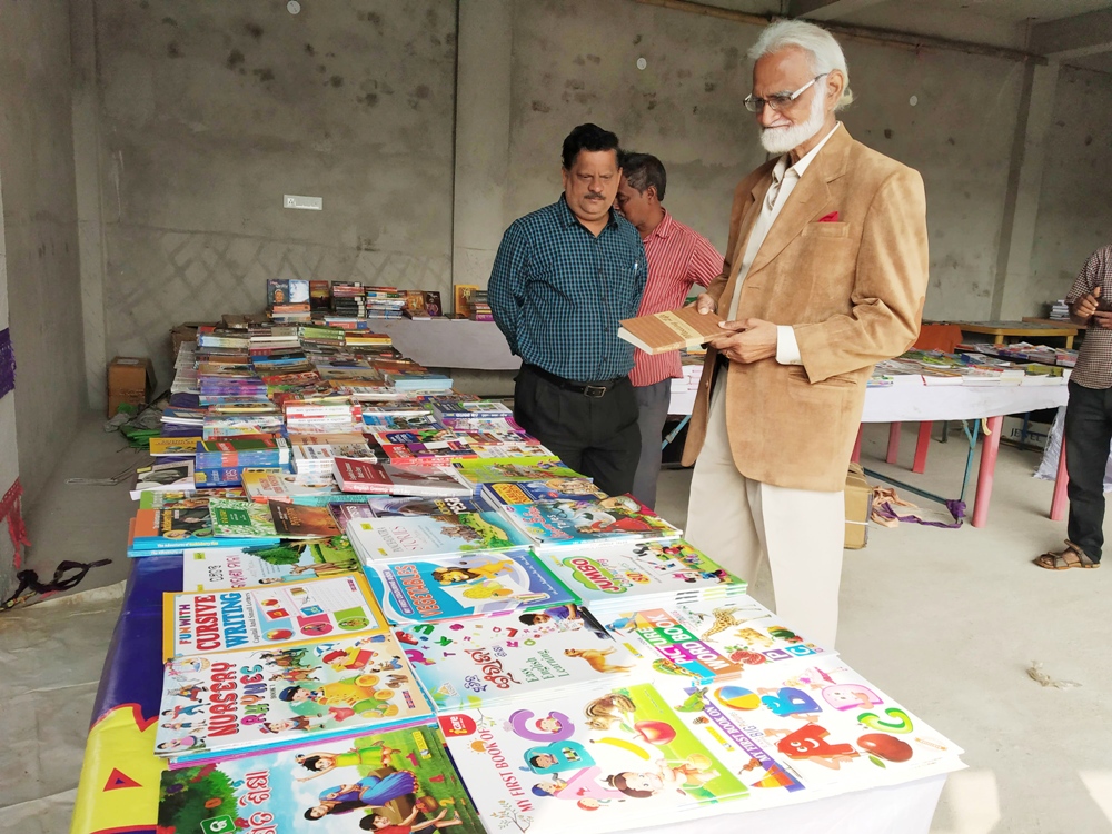 Bonai royal Bira Keshari Indra Deo checks a book after inaugurating a book fair at Sri Aurobindo Integral Education and Research Centre in Bonai of Sundargarh district, Monday