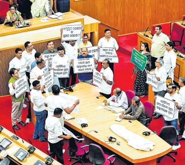 The Opposition members trooped into the Well of the House before Speaker Surama Padhy took her seat for the Question Hour. They carried a symbolic ‘body’ wrapped in white cloth into the House and placed it on the reporters’ table, and shouted anti-government slogans.