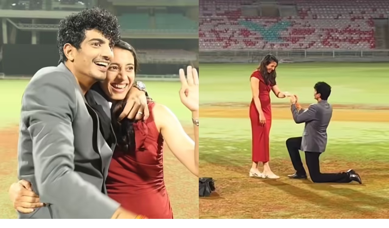 The clip begins with Palash guiding Smriti, who is blindfolded, to the middle of the ground at the DY Patil Stadium in Mumbai. When she finally removes the blindfold, she finds her longtime boyfriend down on one knee, proposing to her. A delighted and emotional Smriti accepts the proposal. Moments later, friends of both Smriti and Palash rush to the centre of the pitch to celebrate the special occasion with the couple. Palash’s sister, Palak Muchhal, also a popular singer, joined them at the venue. Smriti and Palash are set to tie the knot Sunday, 23 November.