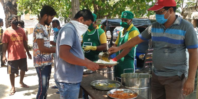 People collecting food from an Aahaar centre at Sishu Bhawan in Cuttack in the wake of lockdown, Saturday