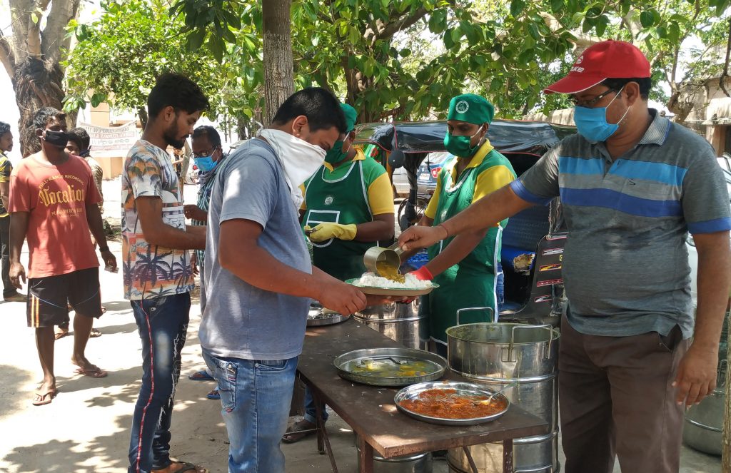 People collecting food from an Aahaar centre at Sishu Bhawan in Cuttack in the wake of lockdown, Saturday
