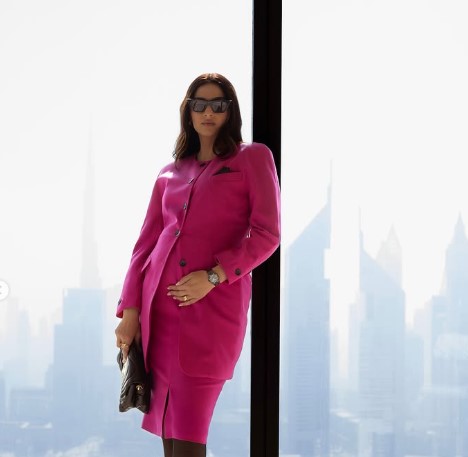 Sonam took to Instagram, where she shared a picture of herself dressed in a striking hot-pink pure wool suit featuring oversized padded shoulders and a softly curved shoulder line. The actress is seen lovingly holding on to her blossoming baby bump.