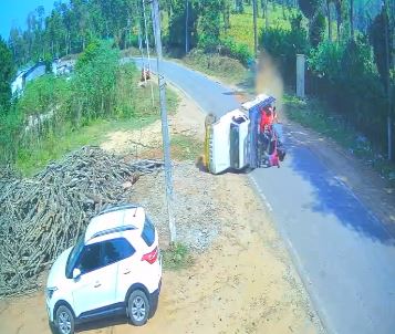 An accident on the Madikeri–Somwarpet State Highway in Karnataka has stunned viewers on social media. A speeding pickup truck overturned while attempting a turn. The video shows the vehicle approaching at high speed, losing control, and flipping over mid-turn. The pickup came to a halt on the road with several of its occupants thrown out.