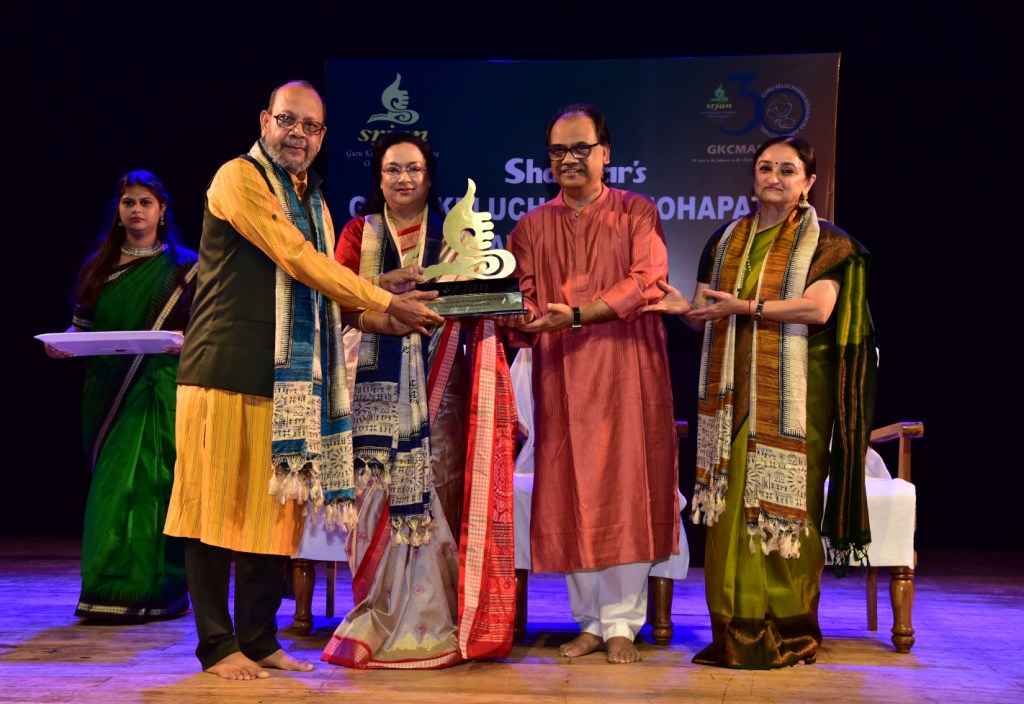 The last evening commenced with the award ceremony, followed by the much-awaited finale by the Srjan ensemble led by Guru Ratikant Mohapatra. The awards were presented to four iconic figures of the state. The Shalimar Guru Kelucharan Mohapatra Awards 2024, carrying an allocation of Rs. 1,00,000/- and a citation, were presented to Kumkum Lal for her contributions to Odissi dance, Guru Lakshmikanta Palit and Guru Dhaneswar Swain for their lifetime achievements in the fields of music and percussion, respectively, and to veteran actor Uttam Mohanty (received by his wife actress Aparajita Mohanty) for his outstanding contributions to Odia cinema.