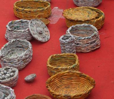 The seven-member group has designed a use-and-throw pen from discarded papers, diary from waste cloths, egg trays from paddy straw, cloth baskets from old newspapers, item-holding boxes from chicken wings and ceramic pottery.