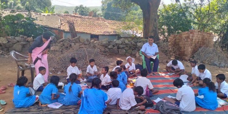 Damanjodi: Children’s studies in Kumbharaguda village under Charangula panchayat and Semiliguda block in Koraput district have been hit hard as the primary school building here is in a dilapidated condition with cracks appearing on the walls and the roof. This has also put the children’s lives at risk. Fearing that the building may collapse at any moment, teachers are taking their classes under a tree in front of the school building.
