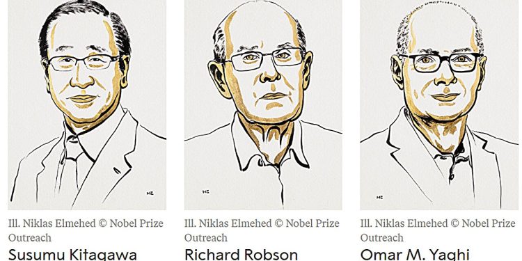 Stockholm: Susumu Kitagawa, Richard Robson and Omar M Yaghi share the Nobel Prize in chemistry for their work in the development of metal–organic frameworks.
