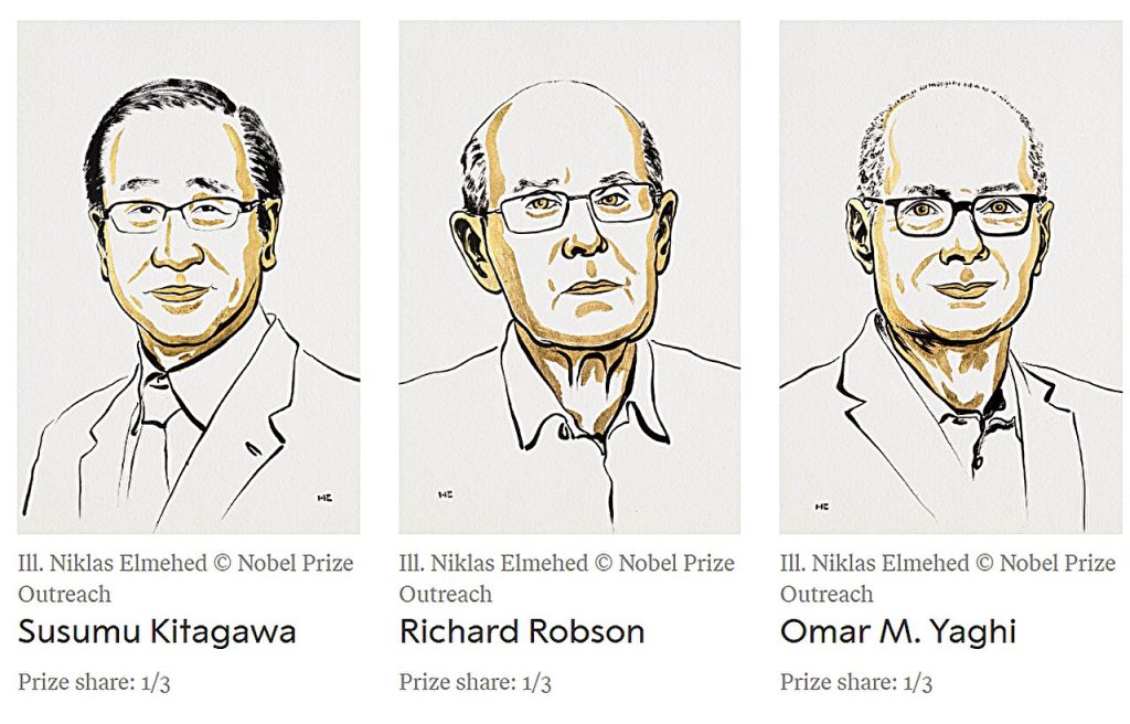 Stockholm: Susumu Kitagawa, Richard Robson and Omar M Yaghi share the Nobel Prize in chemistry for their work in the development of metal–organic frameworks.