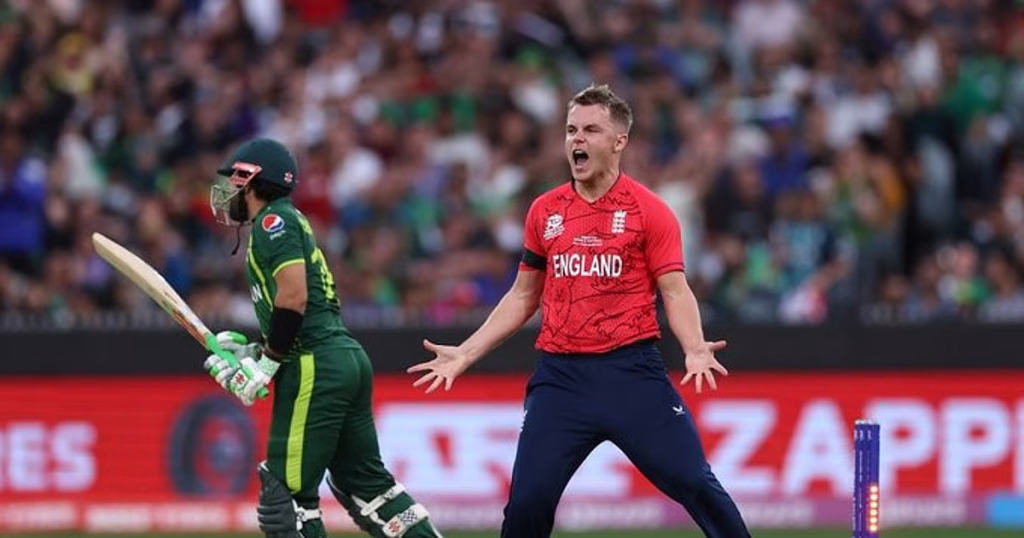 Pakistan: 164 for 9 in 20 overs (Sahibzada Farhan 63; Liam Dawson 3/24) vs England.