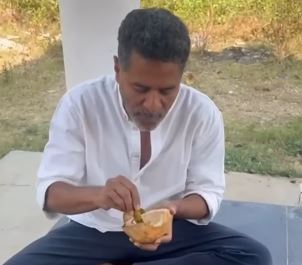 The actor, holding half of the coconut shell in one hand, is seen using a small scrap piece to scoop out the soft malai, devouring it all.