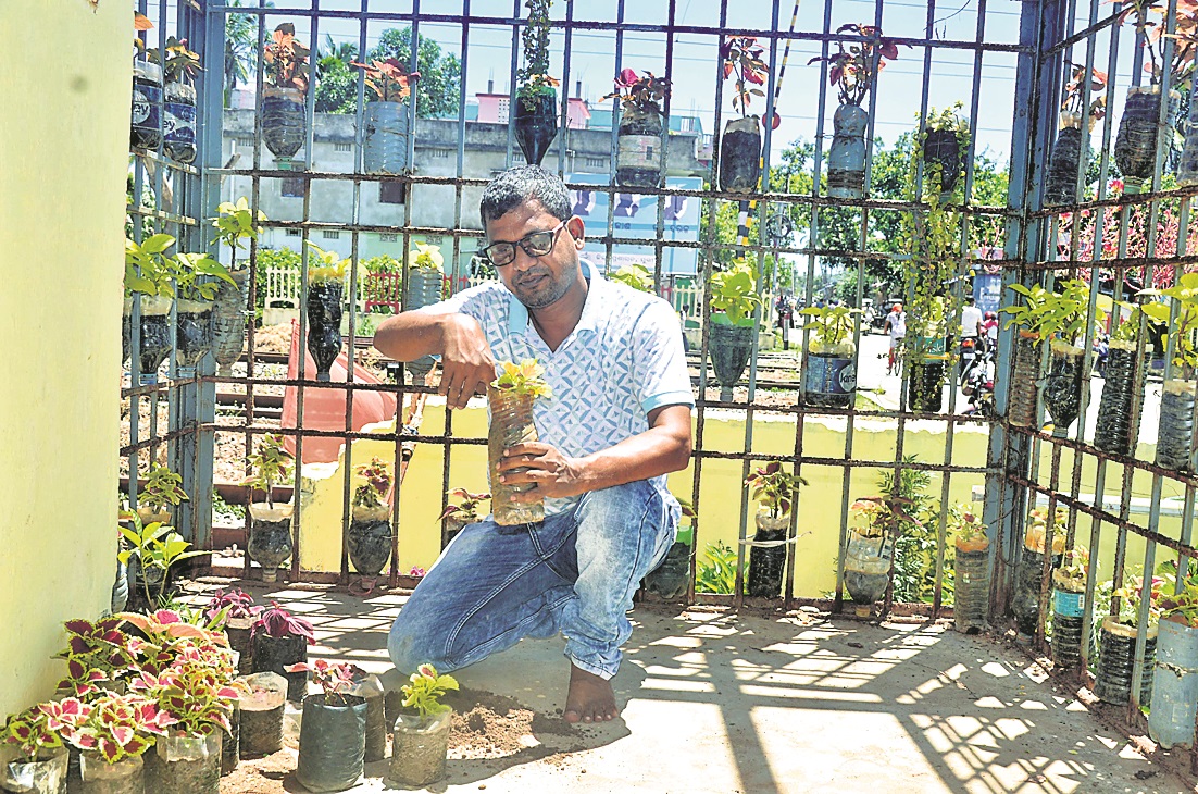 There used to be hundreds of bottles lying scattered near the level crossing, reflecting badly on the level crossing office. “Then I started thinking about on how these bottles could be reused in the best possible way. And the idea of using them for growing flower plants struck me,” he said.