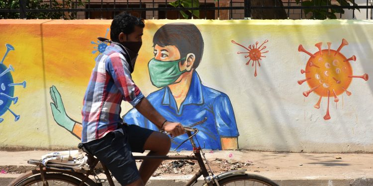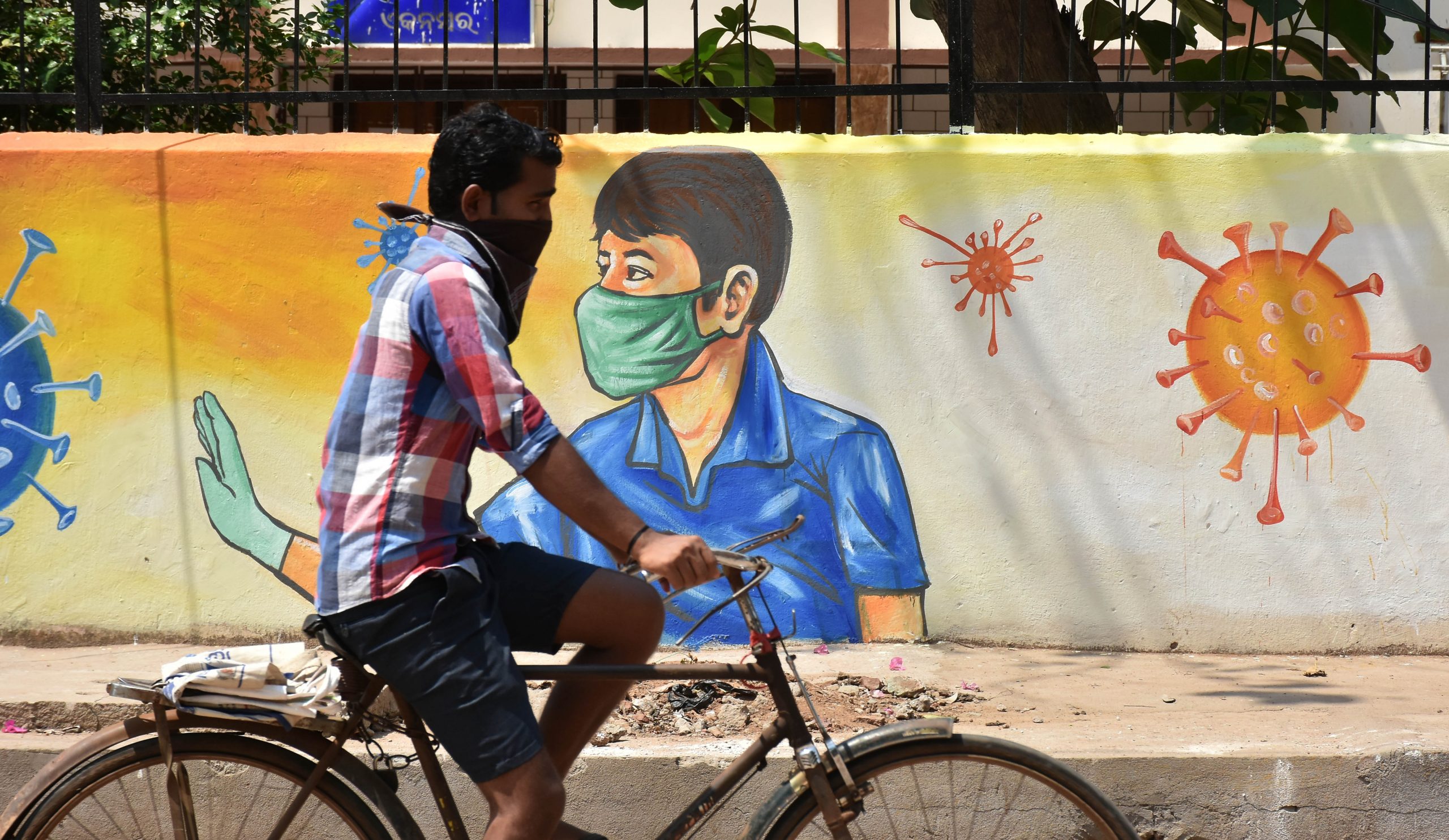 A cyclist pedals past graffiti depicting precautionary measures against coronavirus near Unit-I market in Capital, Friday