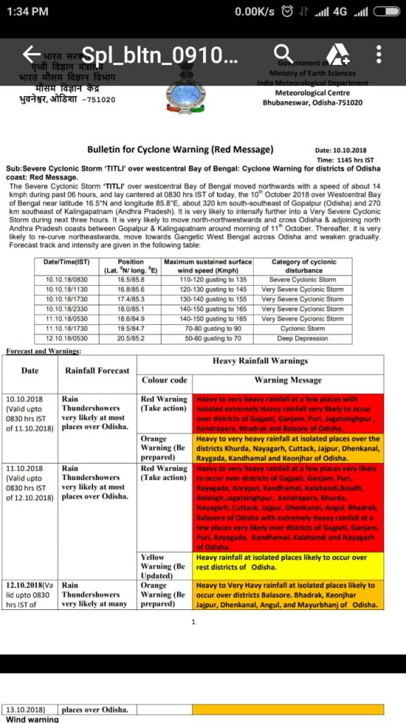 [12:45 PM, 10/10/2018] Collectors of Ganjam, Puri, Jagatsinghpur, Kendrapara and Khurda districts asked to evacuate people residing in low lying areas