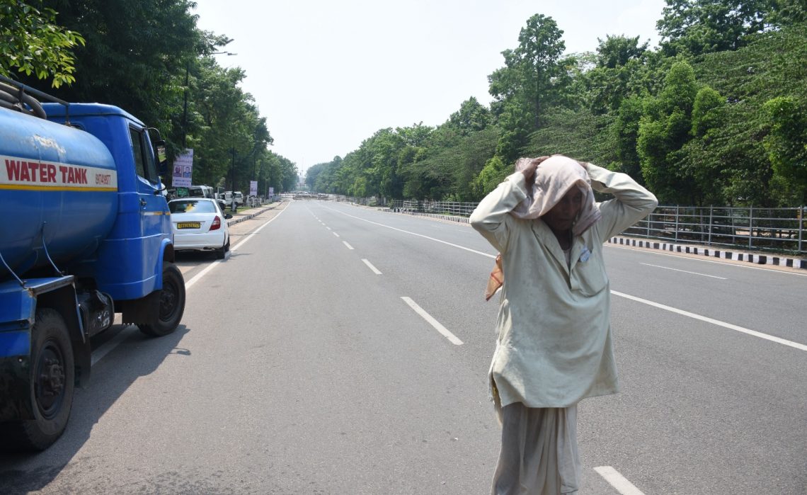 To get respite from unbearable heat, an old pedestrian covers his head with a wet towel in Bhubaneswar