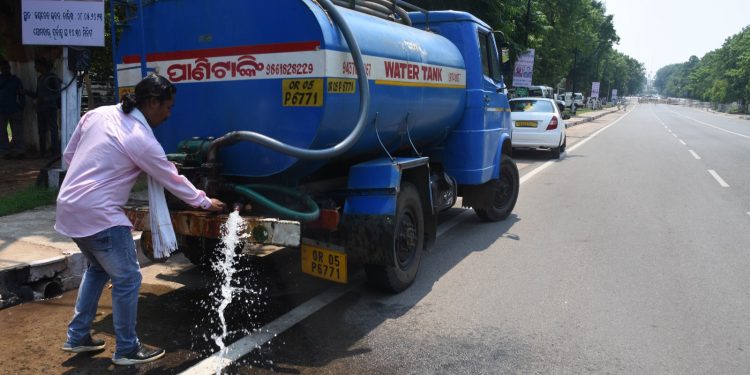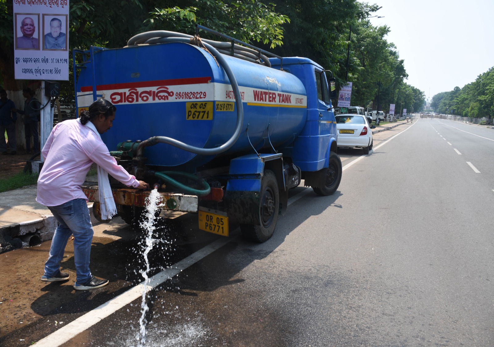 A man runs to close the tap of a water tanker parked near PMG Square in Bhubaneswar