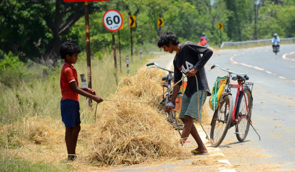 With restrictions on farming easing, children binding bundles of hay to carry them on their bicycles, on the outskirts of Sambalpur