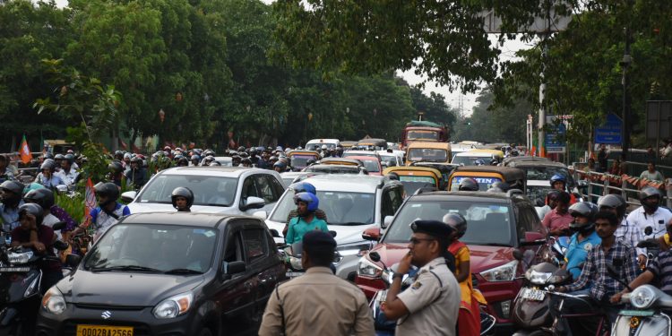 Bhubaneswar: Despite the prior announcement of restrictions on vehicular movement for the swearing-in ceremony of the new government in the state, traffic on major thoroughfares across Bhubaneswar came to a grinding halt Wednesday. The situation was exacerbated, especially, on the route connecting Nalco Square and Acharya Vihar Square, with many commuters stuck for more than an hour. To ensure smooth movement of vehicles during the high-profile event, the Commissionerate Police restricted vehicular movement on the stretch from Jayadev Vihar to Nalco Square from 2 pm to 7 pm. It created a compulsion among the commuters to opt for the Acharya Vihar route, particularly those travelling to the Chandrasekharpur area of the City.