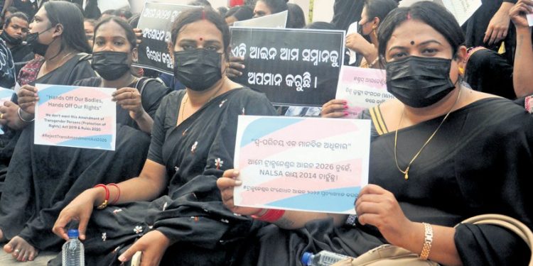 Bhubaneswar: Members of Odisha’s trans gender and gender-diverse community stage a protest here at Master Canteen Square Tuesday, opposing the pro posed Transgender Persons (Protection of Rights) Amend ment Act, 2026 (Bill No. 79). The demonstrators raised concerns that the amendment could un dermine the rights, dignity, and legal recognition of trans gender individuals across the state and beyond.