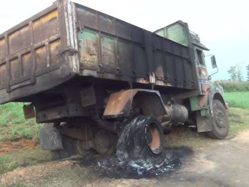 The gang overpowered the truck driver, Shankar of Andhra Pradesh, and beat him up. Later, they set the vehicle on fire and fled the scene. While initial suspicion centred on Maoists, word also spread that some past rivalry involving the contractor who engaged the truck for a construction work might be the reason.