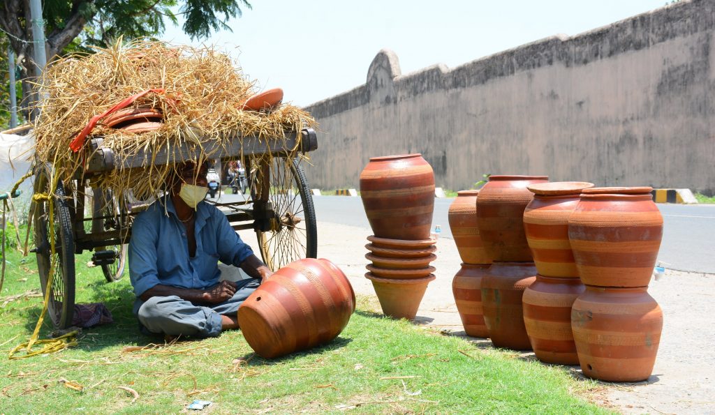 With mercury soaring amid the nationwide lockdown, a potter sitting under his trolley waits for buyers in Sambalpur