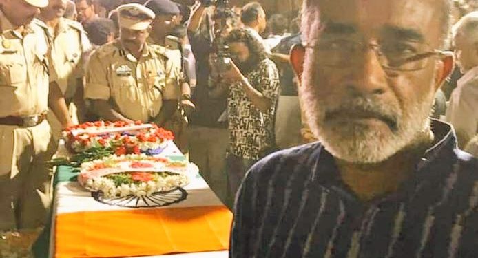 The Minister of State for Tourism posted the picture on his Facebook page Saturday with the caption: “The funeral of jawan V.V. Vasanthakumar was held at the soldier’s home and it is because of soldiers like him that citizens of the country can live peacefully.” The minister reportedly took down the post later after facing criticism.