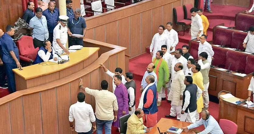 As soon as the House assembled for the day at 10:30am, both BJP and Congress members trooped into the Well, shouted slogans and disrupted the proceedings of the House. The MLAs demanded the Speaker to allow discussion on the issue by admitting the adjournment motion.