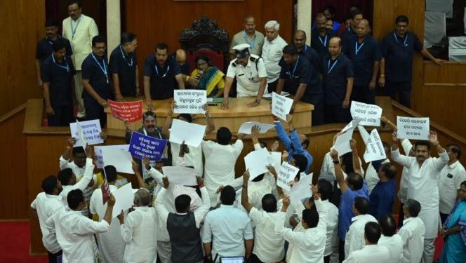 After the House was adjourned, the BJD MLAs held a sit-in near Biju Patnaik’s statue, while the Congress members staged a peaceful demonstration near the Mahatma Gandhi statue on the Assembly premises.