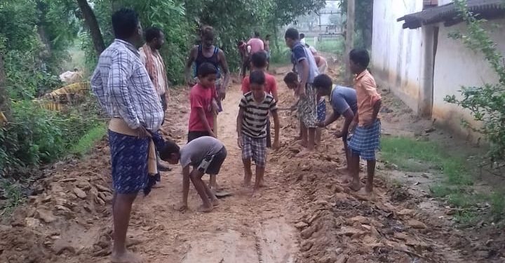 Attabira: After repeated attempts by Naikenpali villagers to get their main road repaired fell on deaf ears of local administration, students of this village under Kadobahal panchayat in Attabira block of Bargarh district joined their hands together and repaired the Naikenpali -Shreeramnagar road Thursday on their own.