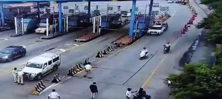 The video shows the scooter suddenly speeding toward the toll plaza. After losing control, the rider crashed directly into the constable. Moments later, nearby individuals and other police officers rushed to the scene to assist the injured constable.