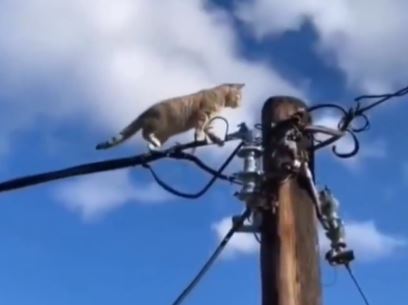 In the clip, the cat can be seen fearlessly balancing on a live wire. As it nears a pole, a sudden burst of electricity ignites the pole, and the cat is violently thrown into the air by the impact. Miraculously, it lands safely on the ground and walks away unscathed, leaving viewers both amazed and amused.