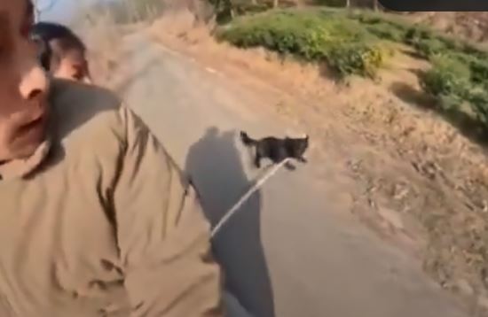 The viral video then shifts to a real-life demo. The man goes for a ride with his daughter seated behind him. They move through streets where dogs are usually known to chase vehicles.