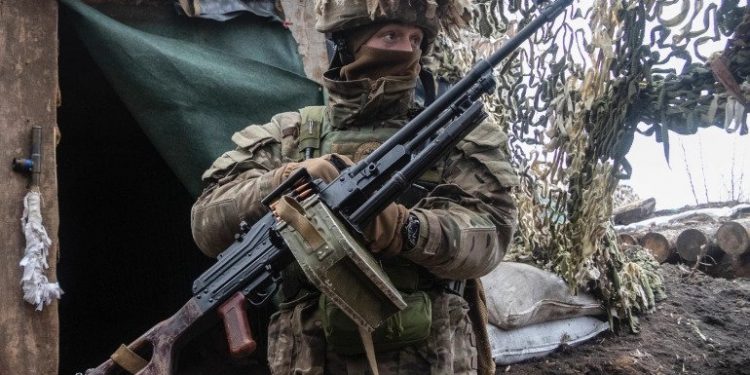 A Ukrainian soldier stands at the line of separation from pro-Russian rebels in Donetsk region, Ukraine [AP Photo via aljazeera.com]