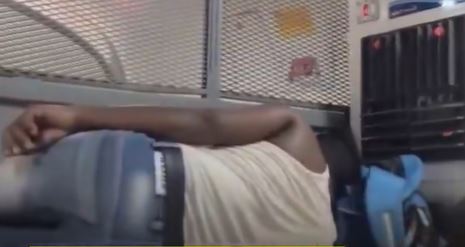 The clip shows a man carrying a small air cooler into a general class compartment and positioning it near his seat so that the airflow is directed toward him. He is later seen lying comfortably as the cooler runs. Fellow passengers nearby appear amused by the unusual arrangement.