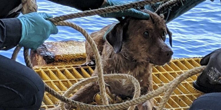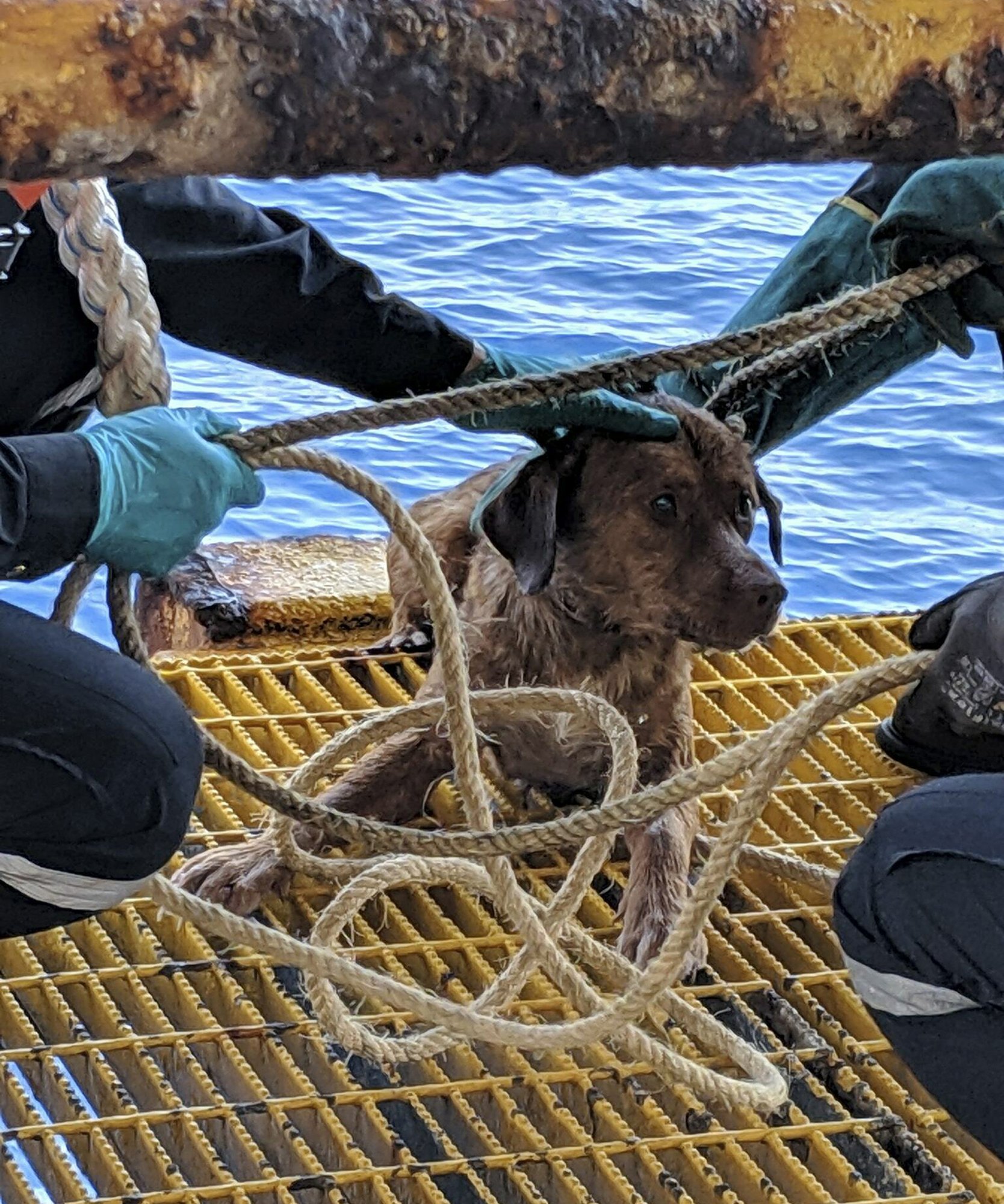 The crew managed to lower a rope and secure it around the dog’s neck and haul it up. Vitisak said they speculated the dog might have fallen off a fishing trawler, and dubbed it Boon Rod, or Survivor.